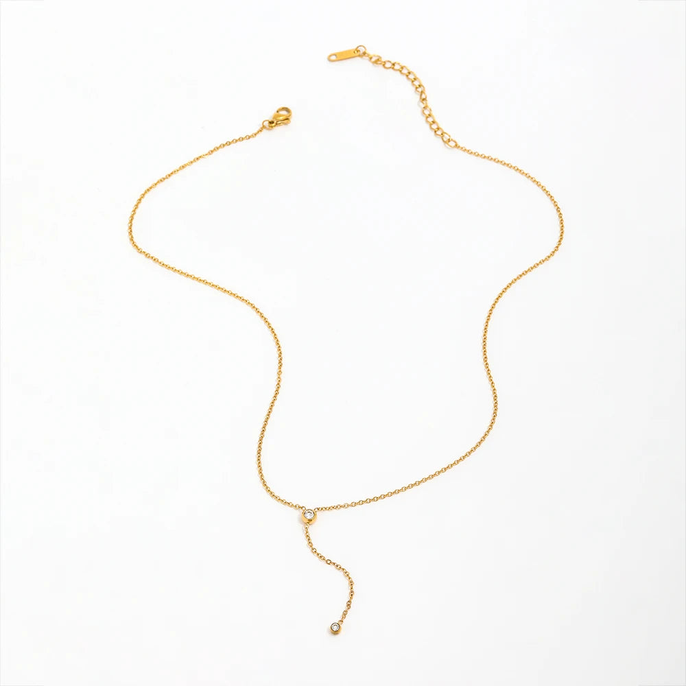 Elevate your jewelry collection with the Joolim 18K Gold Plated Dainty Cubic Zirconia Y-Tassel Pendant Necklace—a harmonious blend of timeless elegance and contemporary design. Crafted from high-quality stainless steel and adorned with a lustrous 18K gold plating, this necklace features a delicate link chain that gracefully descends into a Y-shaped tassel, accented with sparkling cubic zirconia stones, adding a touch of sophistication to any ensemble.